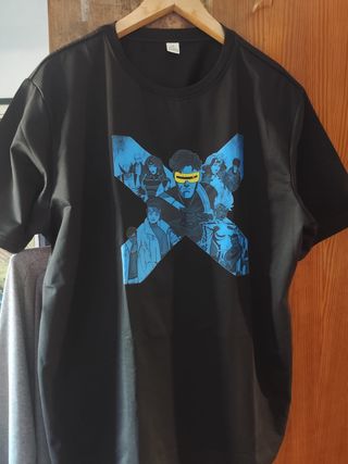 Camiseta de los X-Men con diseño de Cíclope y el resto del equipo en el logo de la X. Poliester Es una talla XL de hombre, el dibujo está muy guapo con los tonos azules sobre el negro. Está nueva, ideal si buscas algo de Marvel que no sea lo de siempre.