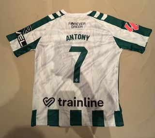 Camiseta de fútbol del Betis con el parche de laliga con el nombre Antony y el número 7. - Diseño con rayas verdes en las mangas y el bajo. - Patrocinador trainline en la parte delantera. - Talla M.