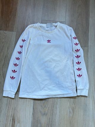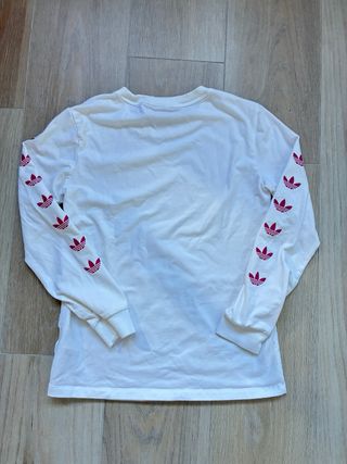 Camiseta de manga larga de Adidas Originals con un diseño llamativo. - Color blanco con detalles en rosa. - Múltiples logos Trefoil a lo largo de las mangas. - Pequeño logo Trefoil en el pecho. 🤝Escucho ofertas, precio negociable. #AdidasOriginals #Logomania #SportyChic #Trefoil #WhiteTee #RetroStyle #Casual