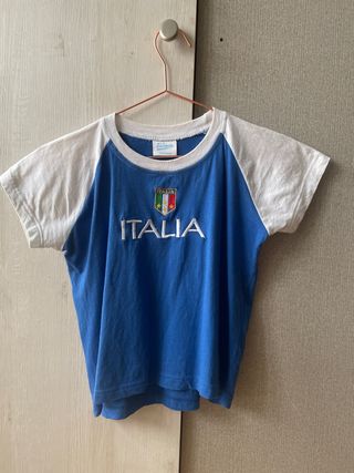 Camiseta de manga corta con diseño inspirado en Italia. - Parte superior blanca. - Cuerpo azul con escudo y nombre de Italia. - Cuello redondo.