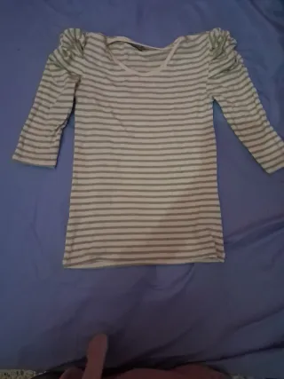 Camiseta de manga larga con cuello redondo. Botones en la parte de la cintura al cuello y en los puños. Diseño con pequeños volantes en los hombros. Cintura elástica por delante. Composición: 62% viscosa y 38% poliéster. Tejido con efecto arrugado. Talla un poco más grande de lo normal para una M de Zara.