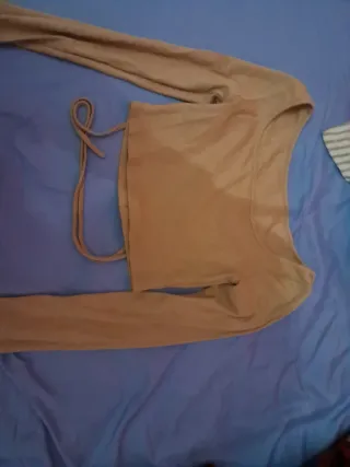 Camiseta beige de manga larga con detalle de lazo. - Diseño crop top. - Tejido suave y elástico. - Detalle de lazada en la espalda.