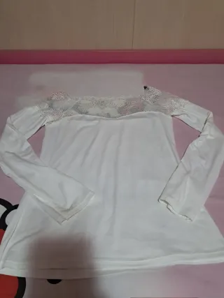 Camiseta blanca de manga larga con detalle de encaje en la parte superior, muy femenina y elegante. Es cómoda, suave y perfecta para looks casuales o para combinar con vaqueros, faldas o blazer. ✔ Talla S ✔ En muy buen estado, sin manchas ni bolitas ✔ Tejido ligero y agradable Ideal para quien busque una prenda básica pero con un toque especial.