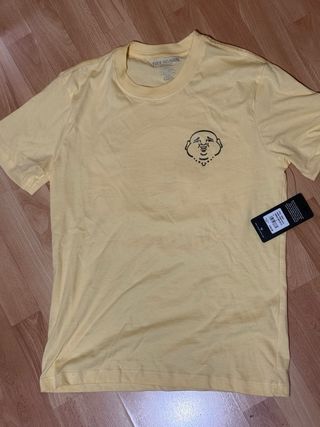 Camiseta de la marca True Religion en color amarillo con un llamativo logo plateado. - Diseño circular con el rostro de Buda. - Inscripción True Religion Brand Jeans alrededor del logo.