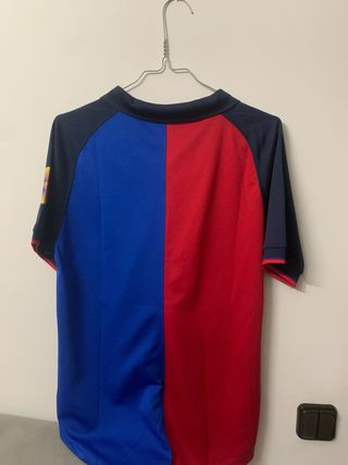 Camiseta conmemorativa del FC Barcelona. - Diseño dividido en rojo y azul. - Detalles dorados con los años 1899 y 1999. - Escudo del club y logo de Nike. - Cuello tipo polo con botones.
