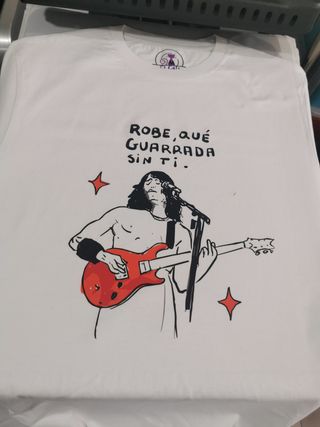Camiseta con un diseño gráfico original. SE EPUEDE ELEGIR COLOR TALLA Y DISEÑO - Ilustración de un músico tocando la guitarra. - Frase Robe, qué guardada sin ti en la parte superior. - Detalles en color rojo y negro.