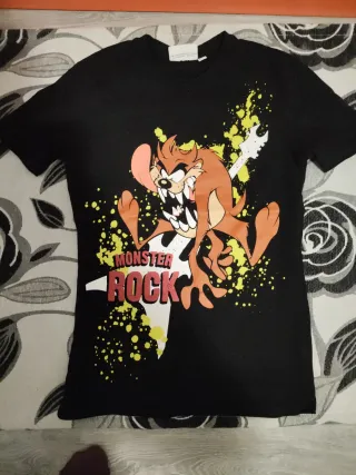 Camiseta negra con un diseño divertido de Taz, el demonio de Tasmania, tocando la guitarra. - Personaje: Taz, el demonio de Tasmania. - Diseño: Monster Rock con salpicaduras. - Estilo: Rock and roll, música.