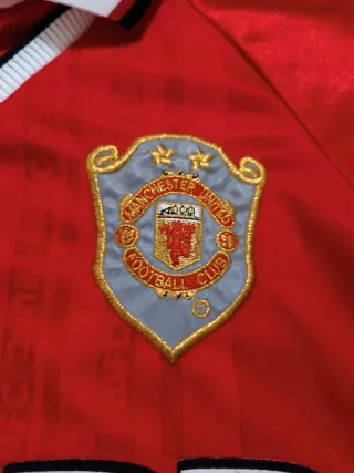 Camiseta de fútbol Umbro del Manchester United de la temporada 1999-2000. - Diseño conmemorativo de la UEFA Champions League. - Logo de Umbro. - Escudo del club. - Patrocinador SHARP.