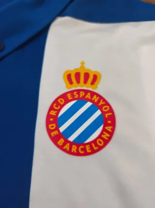 Camiseta de fútbol del RCD Espanyol de la marca Puma, modelo Player Issue. - Diseño con franjas verticales azules y blancas. - Logo de Puma en la manga y el pecho. - Escudo del RCD Espanyol en el pecho. - Patrocinador POWER 8 en el frontal.