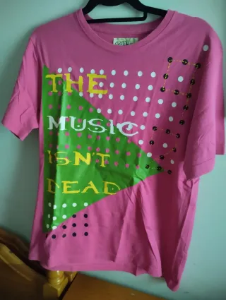 Camiseta de manga corta con un diseño llamativo. Entrega en Parla o Madrid. Pago en efectivo. - Color rosa vibrante. - Estampado frontal con texto THE MUSIC ISN'T DEAD en verde y amarillo. - Detalles de lunares blancos y negros.