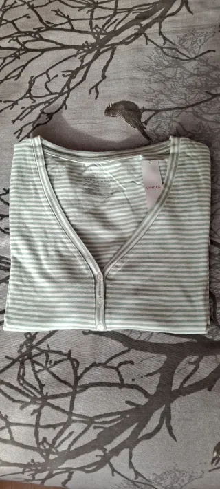Camiseta de Lindex con un diseño de rayas finas en verde y blanco. Es una prenda cómoda y versátil. - Aunque talla S, es amplia y da hasta M - Cuello en V. - Cierre de botones. - Tejido suave.