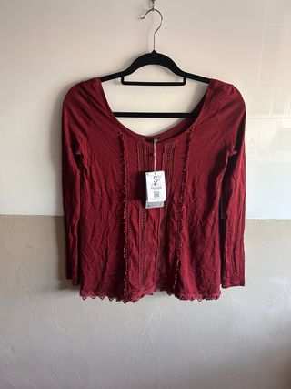 Camiseta de manga larga con detalles de encaje y puntilla en el bajo. - Cuello redondo. - Diseño con pasamanería y detalles de crochet en el frontal. - Bajo con puntilla festoneada.