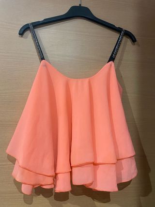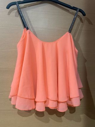 Bonita camiseta con un diseño de volantes en cascada. Las tiras son finas y adornadas. - Diseño de volantes en cascada. - Tiras finas con detalle de abalorios. - Tiene esas dos taras.