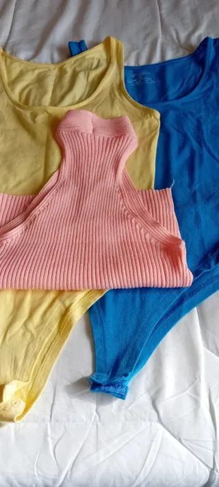 Lote de 4camisetas para y 2 bodis chicas. Top rosa al cuello sin manga y espalda al aire Camiseta rosa con estampado. Camiseta negra con pedrería LOVE. Si quieres lo envío Camiseta amarilla. Camiseta azul.