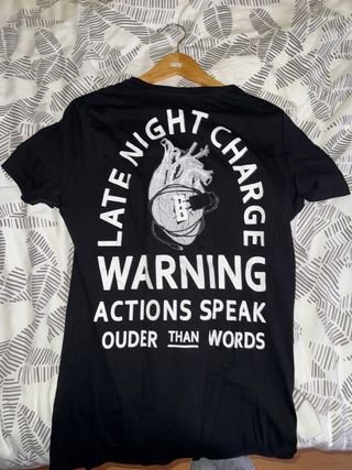Camiseta negra con un diseño gráfico llamativo en la espalda. - Estampado Late Night Charge con un corazón y un enchufe. - Frase WARNING ACTIONS SPEAK LOUDER THAN WORDS debajo del gráfico.