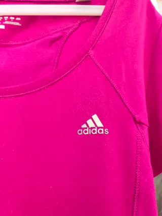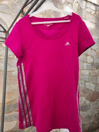 Camiseta deportiva Adidas de color rosa. TALLA M\L ORIGINAL - Diseño con las tres rayas plateadas en el lateral. - Tejido transpirable para mayor comodidad. - Logo de Adidas en el pecho.