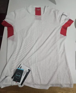 Camiseta de manga corta con detalles distintivos. - Cinta roja con logo en los hombros.