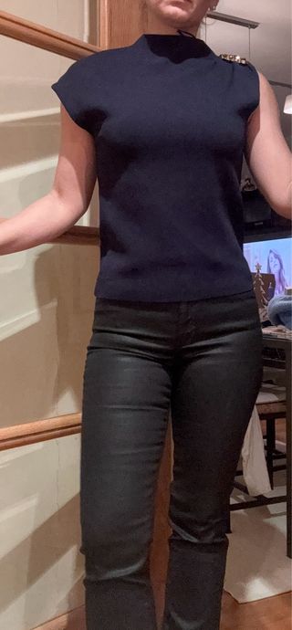 Camiseta de punto en color azul marino con detalle dorado en el hombro. - Diseño sin mangas. - Cuello alto. - Adorno metálico en el hombro.