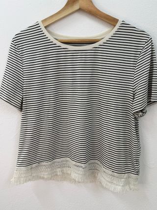 Camiseta de rayas con un detalle de flecos en el bajo. - Diseño de rayas horizontales. - Bajo con detalle de encaje y flecos.