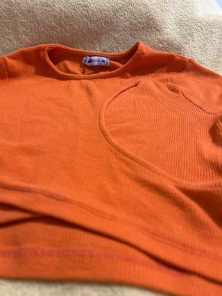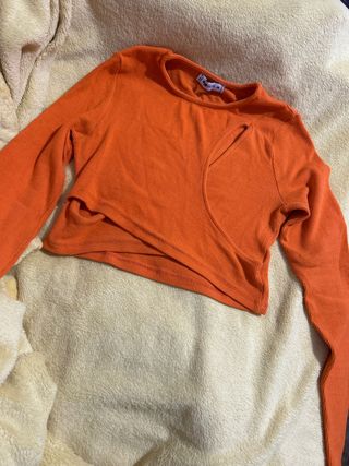 Camiseta de manga larga en color naranja. Presenta un diseño cruzado y un corte asimétrico en la parte delantera. - Tejido de canalé. - Manga larga. - Diseño cruzado.