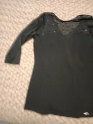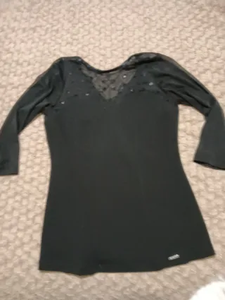 Elegante camiseta negra con un diseño especial. - Mangas largas. - Escote en V con detalles de pedrería y tejido semitransparente. - Pequeño detalle metálico en la parte inferior.