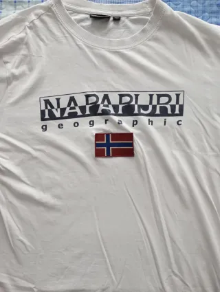 Camiseta blanca de manga corta de la marca Napapijri original. Presenta el logo de la marca "NAPAPIJRI geographic" junto con la bandera de Noruega debajo en la parte frontal de la camiseta. La bandera no està integrada en el mismo tejido de la camiseta, sinó que es de ropa, con relieve, característica clave para diferenciar que es original respecto a una imitación. Además, està todas las etiquetas. Comprada en la tienda online oficial de la marca por 40€. Largo de la prenda: 70cm Ancho de prenda (hombro-hombro): 43cm Largo de mangas: 18cm Referencia: 183cm, 72kg. Ajuste a la perfección. Cualquier duda, estoy a vuestra disposición.