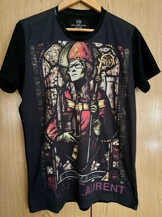 Camiseta de la marca MY BRAND con un diseño gráfico de Yves Saint Laurent. - Estampado frontal detallado. - Mangas cortas. -Pequeños cristales en la parte inferior