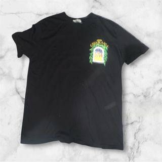 Camiseta negra con un diseño artístico en la espalda. - Estampado de Avenida Casablanca con un marco de hojas verdes. - Ilustración de un edificio histórico visto a través de un arco.
