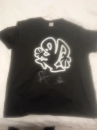 Camiseta negra con diseño de Plastikman, firmada por Richie Hawtin. - Diseño de Plastikman en blanco. - Firma de Richie Hawtin.