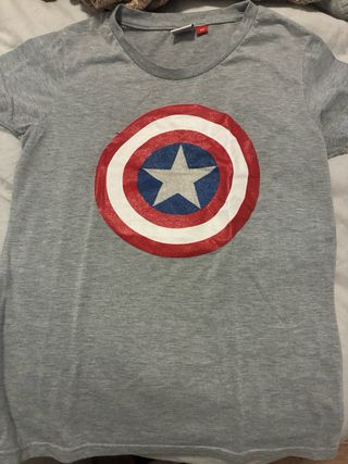 Camiseta gris con el escudo del Capitán América. - Diseño icónico del Capitán América. - Detalles en rojo, blanco y azul.