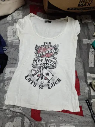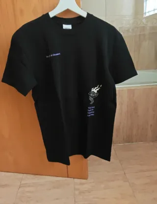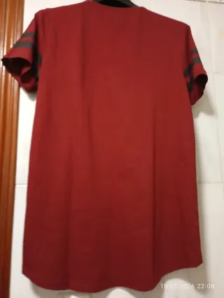 Sin estrenar, ya que aunque pone talla M equivale a una S y no me vale. Las medidas están en las fotos. El serigrafiado está un poco descentrado