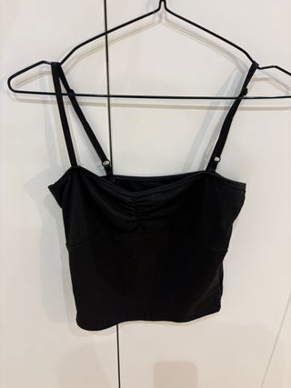 Camiseta verde de estilo halter con un diseño fruncido y una anilla metálica en el escote. - Tejido acanalado. - Tirantes finos. - Corte crop top. Los tirante se pueden combinar. Poco uso. Mira mi perfil, seguro encuentras algo que te guste