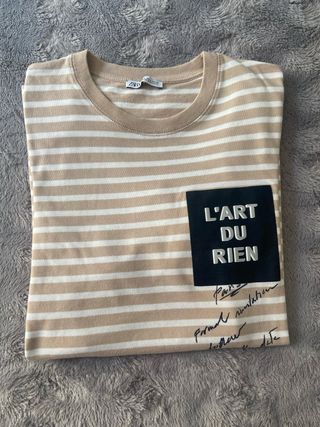 Camiseta de Zara con un diseño de rayas horizontales en tonos beige y blanco. Presenta un detalle de parche negro en el pecho con texto. - Diseño de rayas. - Parche con texto L'ART DU RIEN y firma. - Cuello redondo.