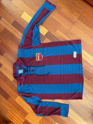 Camiseta estilo retro del FC Barcelona, de manga larga y con cordones en el cuello. Diseño clásico con las rayas azulgranas y el escudo bordado. ✔ Estilo vintage / retro ✔ Manga larga ✔ Muy cómoda y original ✔ Estado: buen estado general (ver fotos) Perfecta para aficionados del Barça o coleccionistas de camisetas retro. 📍 Entrega en mano en Madrid y Salamanca 📦 Envío disponible por Vinted / Wallapop