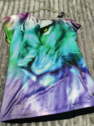 Camiseta de mujer con un llamativo estampado de león en tonos verdes y morados. El diseño es vibrante y detallado, tiene un pequeño engancho en la parte de delante pero apenas se nota. - Diseño frontal de león. - Mangas cortas. - Cuello redondo.
