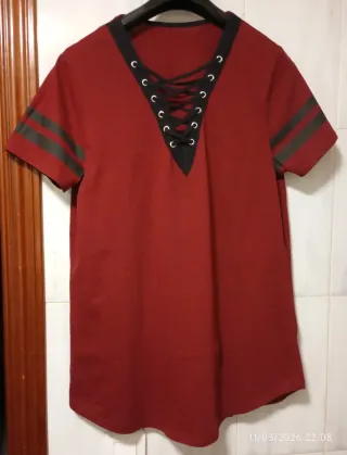 Camiseta de manga corta con un diseño moderno y llamativo. Medidas de axila a axila 51 y largo 78. - Cuello en V con cordones negros. - Detalles de rayas en las mangas. - Ribete negro en el cuello.
