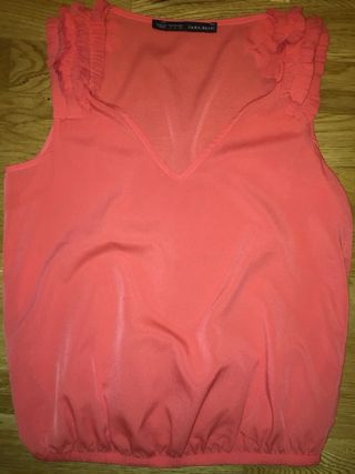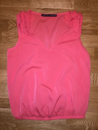 Camiseta sin mangas de Zara en color rosa vibrante. Presenta un escote en V y detalles fruncidos en los hombros. - Diseño sin mangas. - Escote en V. - Detalle de volantes en los hombros. - Bajo elástico. Escucho tu oferta