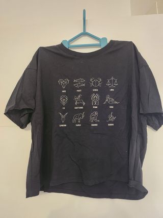 Camiseta negra con un diseño estampado de los doce signos del zodiaco. - Diseño de constelaciones y nombres de los signos. - Estampado en blanco.
