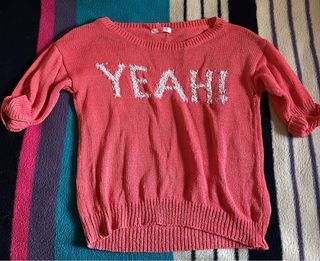 Camiseta de punto con un diseño divertido y llamativo. - Color rosa vibrante. - Detalle de letras blancas YEAH! bordadas en el pecho. - Manga 3/4 con vuelta. - Cuello redondo. - Pequeño agujero apreciable en fotos, se puede coser sin problema