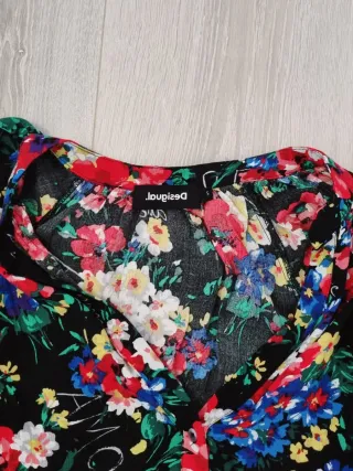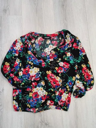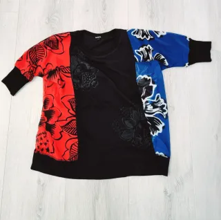 Camiseta con un diseño vibrante y original. - Mangas con estampado floral azul y rojo. - Cuerpo principal en color negro. - Detalle de estampado floral en el cuerpo. Talla S válida también para M ! Cuento con dos unidades por si interesa ( el precio es por unidad)