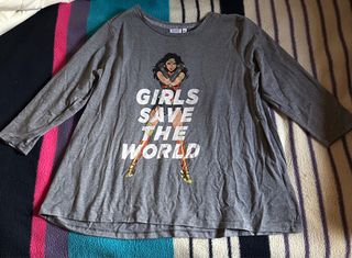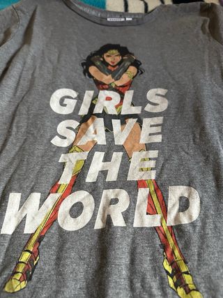 Camiseta de manga 3/4 con un diseño de Wonder Woman. - Estampado frontal de Wonder Woman. - Frase Girls Save The World en blanco.