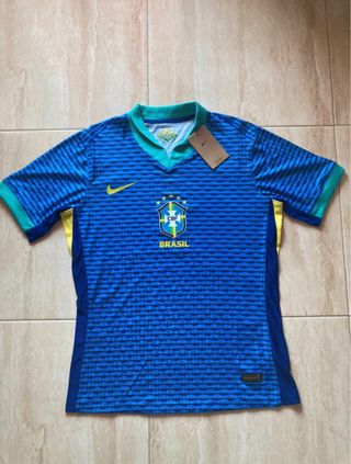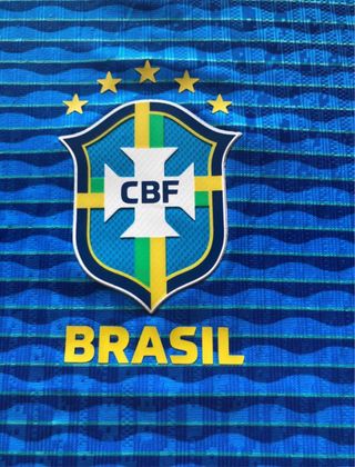 Camiseta de fútbol de Brasil con diseño moderno. - Diseño con líneas horizontales en azul. - Detalles en verde y amarillo. - Escudo de la CBF y logo de Nike.