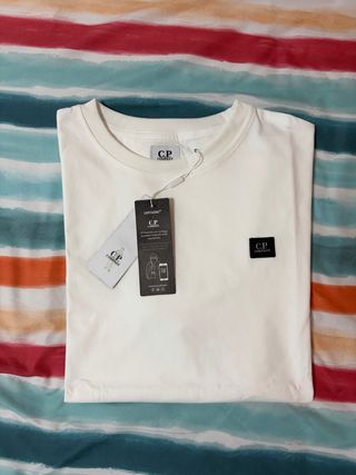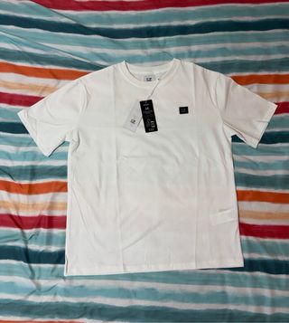 Camiseta de manga corta de la marca CP Company en color blanco. Logo cuadrado en el pecho de color negro - Cuello redondo. - Etiqueta interior con detalles de la marca. - Incluye etiquetas originales.