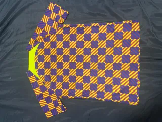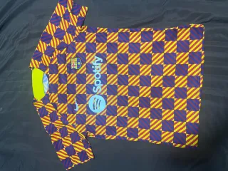 Camiseta del FC Barcelona con diseño a cuadros en morado y amarillo. Luce el logo de Spotify y el escudo del club. - Diseño a cuadros llamativo. - Logo de Spotify en el frontal. - Escudo del FC Barcelona.