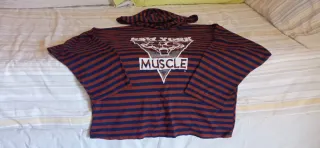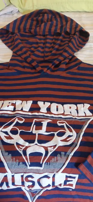 Camiseta con capucha de rayas en tonos azul marino y marrón. Presenta un diseño gráfico en la parte delantera. - Diseño de rayas horizontales. - Estampado frontal con texto New York Muscle.