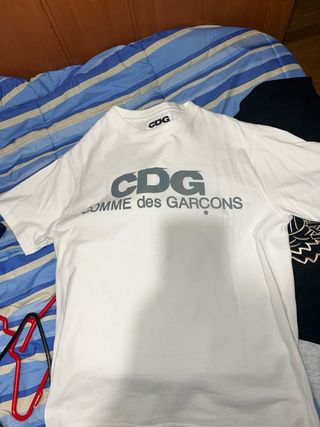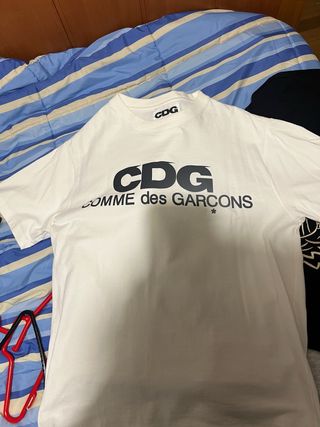 Camiseta blanca con el logo de CDG y COMME des GARÇONS estampado. - Cuello redondo. - Manga corta. Las letras brillan con el flash