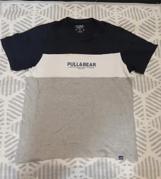 Conjunto de dos camisetas para hombre. - 1 camiseta técnica para hombre azul con lineas negras. Life's. Cuello redondo. Manga corta. Pone talla XL pero si observas la última foto donde ambas están superpuestas, es exactamente igual que la Pull & Bear que pone talla L. - 1 camiseta Pull &Bear.