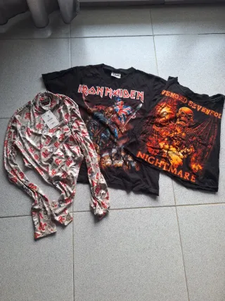 Pack de 4 camisetas con diseños de grupos de rock y 2 diseño horror. - Camiseta negra con logo de Iron Maiden talla M. - Camiseta negra con diseño de calavera y texto Nightmare, de Avenged Sevenfold. - Body AC/DC estampado talla M Bershka. -Camiseta larga, tipo vestido Megadeth talla XS. - Camiseta I zombies talla S. - Camiseta Horror talla M