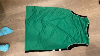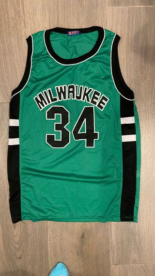 Camiseta de baloncesto estilo Milwaukee con el número 34. - Diseño de malla. - Detalles en negro y blanco en los laterales. - Cuello y sisas con ribete negro y blanco.
