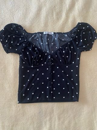 Preciosa camiseta de lunares o polka dots muy en tendencia. Es una talla S. Es muy coqueto y romántico. Esta prácticamente nuevo ya que se me quedó pequeño al poco de cómpralo. Es un básico en el armario que todas necesitamos.